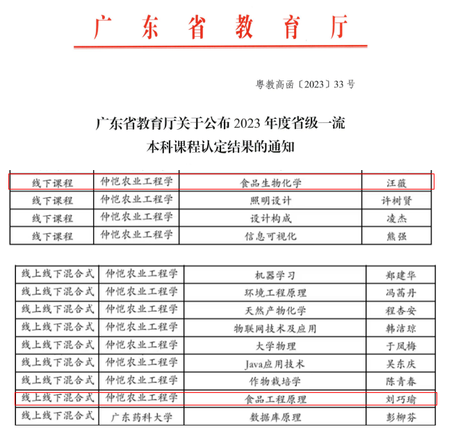 2023年12月14日,广东省教育厅公布了2023年度省一流本科课程认定名单,《食品生物化学》、《食品工程原理》分别被认定为广东省线下一流课程和线上线下一流课程。