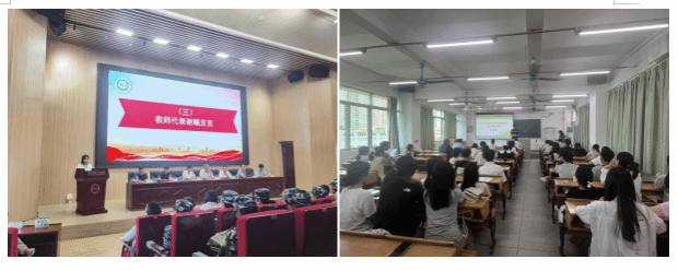 学院食品科学与工程系副主任谢曦和研究生导师马路凯分别作为教师代表发言。谢曦老师以智慧之光,照亮了新生前行的道路,她倡导“目标为舵,计划为帆,信心为桨,坚持为舟”的八字箴言,激励学子们扬帆远航,勇往直前。马路凯老师则以自身科研探索历程为例,为研究生新生指引前行的目标,他勉励全体新生,术海无涯,当潜心求索,要始终保持求知与热爱,秉持批判精神和创新精神,注重团队协作和个人修养,砥砺奋进,再创辉煌。