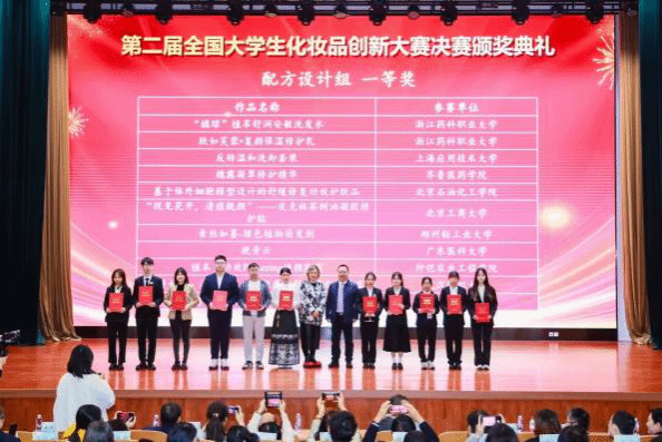 2024年11月1日,在教育部高等学校轻工类专业教学指导委员会指导下,以“创新驱动美妆进步 青春助力梦想腾飞”为主题的第二届全国大学生化妆品创新大赛决赛在北京工商大学良乡校区正式拉开帷幕。本届大赛吸引来自全国百余所高校的 400 多支队伍报名参赛。本次比赛有三个组别,分别是产品创意组、配方设计组和包装宣传组。经过初赛专家评审,有94支队伍脱颖而出,成功入围决赛。11月1日决赛答辩后,在监督委员会监督下,经评审委员会审核,大赛组委会审定,最终评选出一等奖32支队伍,二等奖62支队伍。