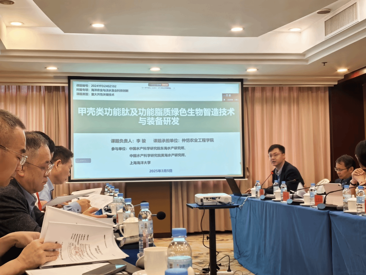 会议伊始,项目负责人及各课题负责人分别汇报了项目执行与管理方案。我校李骏副研究员作为课题2“甲壳类功能肽及功能脂质绿色生物智造技术与装备研发”的负责人,代表课题组进行了详细汇报。该课题由仲恺农业工程学院主持,联合中国水产科学研究院东海水产研究所、黄海水产研究所及上海海洋大学共同承担,重点围绕甲壳类水产品副产物功能肽、功能脂质的绿色生物加工与智能装备研发开展技术攻关,旨在推动甲壳类水产品副产物的高效利用,提升产业附加值。