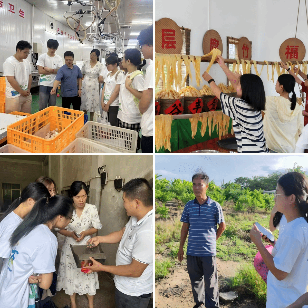在产业帮扶行动中,学院多支团队发挥专业优势,助力乡村食品产业提质增效。菌类预制菜研制队深入广东代米生物科技有限公司,学习金针菇全链条生产工艺,并开发出菌菇鸡汤、菌香骨头汤等三款预制菜产品,为菌类产业升级提供新思路。英德助农小分队走进红薯干和腐竹生产基地,通过直播展示传统工艺与现代质检流程,助力打造“可追溯、高品质”农产品品牌。此外,食安筑梦突击队为揭阳市桂岭镇提出“微生物-植物协同净化方案”等创新建议,梅州茗探队则通过品鉴会和实地调研,探索客家炒绿高质量发展路径。