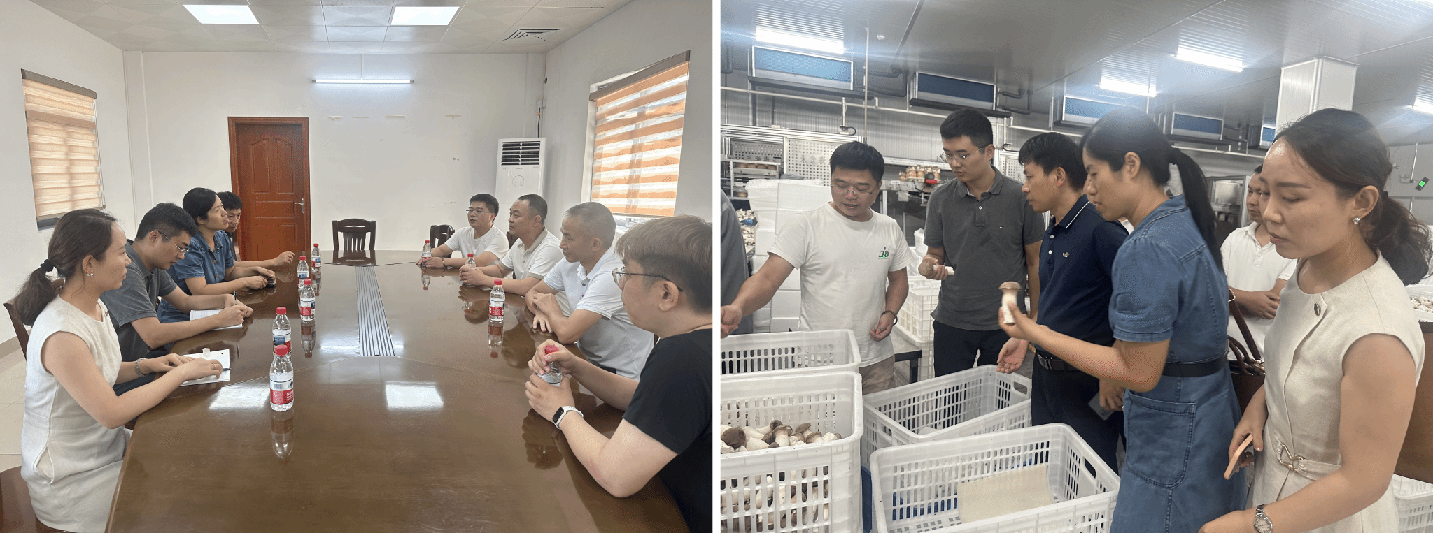 团队首站走访广东省重点农业龙头企业——广东代米生物科技有限公司。近年来,随着食用菌产业规模不断扩大,企业面临人工分拣效率低、产品标准化程度不高等瓶颈问题。科技特派员团队深入生产一线考察,并与企业技术人员就“杏鲍菇智能分拣系统设计方案”进行研讨,围绕分选效率、设备集成、成本控制与推广可行性等方面展开深入交流,致力推动该系统从方案设计到落地应用的全流程攻关。