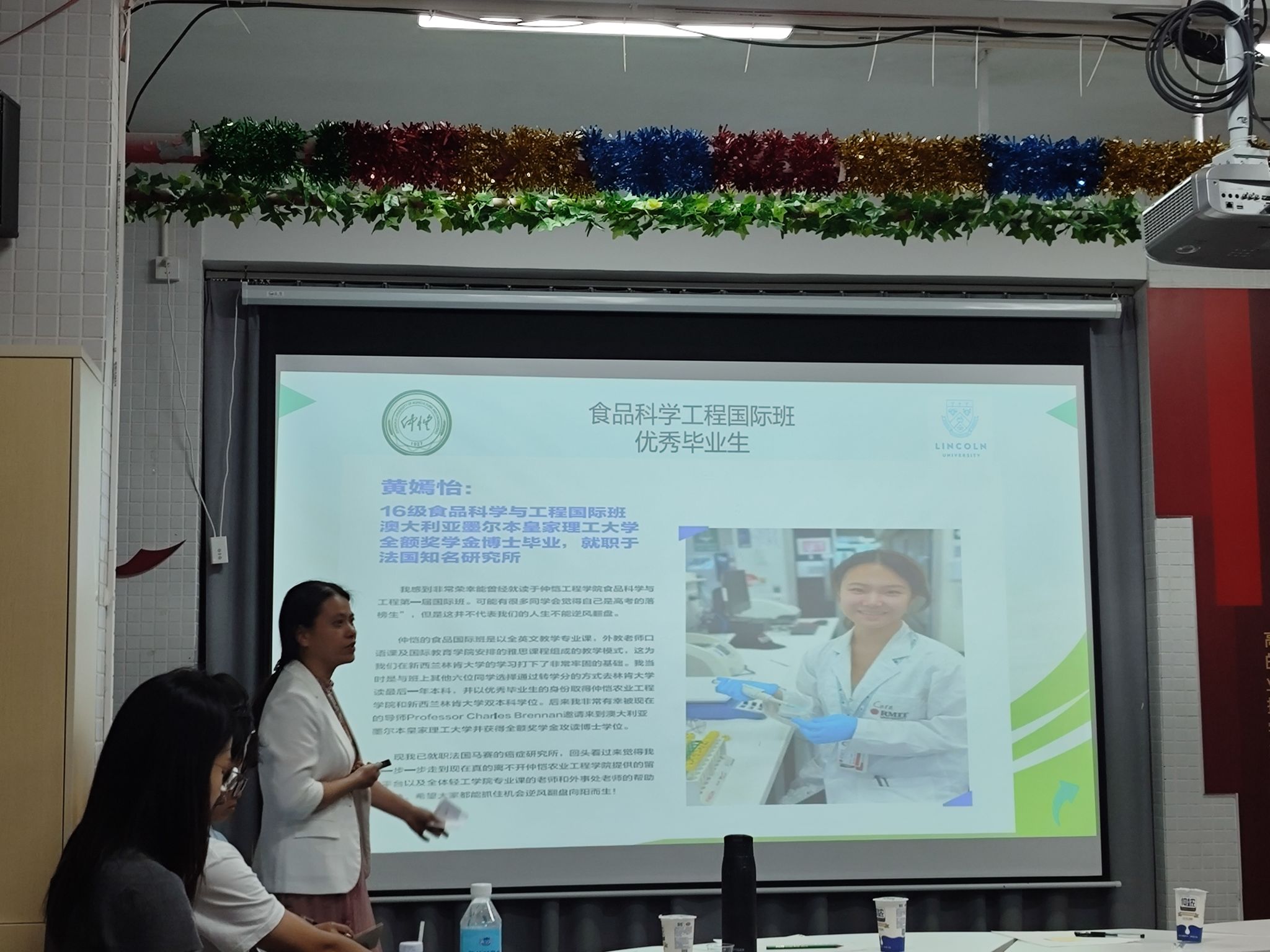 沙龙特邀三位嘉宾联袂开讲:深耕食品微生物学前沿、由国际教育学院资助赴新西兰访学归来的学院生物工程系副主任梁景龙博士;心系母校、以产业报国回报桑梓的优秀校友、广州仲农乳业有限公司总经理梁鹏云;专精于国际化人才培养的国际教育学院副院长刘敏姬。三位嘉宾分别从国际前沿、产业实践与学业路径视角,为同学们呈现了一场思想深刻、内容丰富的知识盛宴。