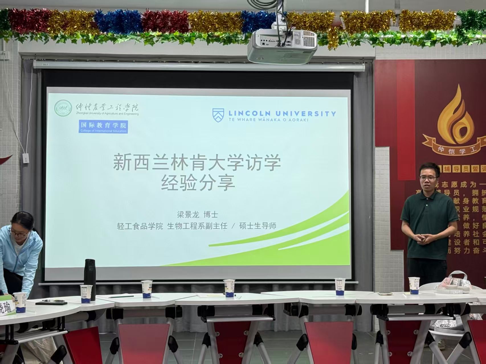 梁景龙博士以在新西兰林肯大学的访学经历为主线,分享了其在课程体系、科研模式与文化交融方面的深度观察。他剖析了林肯大学注重实践应用、紧密衔接产业的课程设置,指出其与我国推进“产教融合”的战略方向高度契合。通过亲身参与海外顶尖食品微生物课题研究的经历,梁景龙生动阐述了国际科研合作对于突破创新、提升关键领域科研能力的重要价值,并鼓励同学们勇于拥抱跨文化挑战,为将来参与全球科技竞争与合作夯实基础。