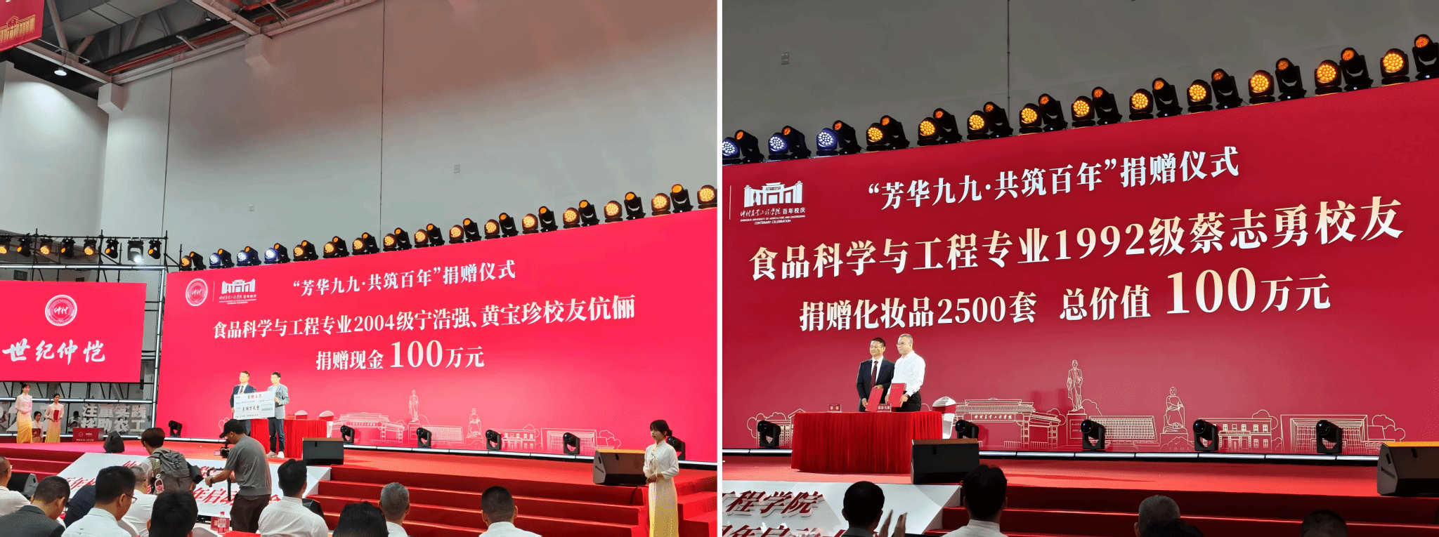 当天上午,学校百年校庆倒计时一周年启动大会在霍英东体育馆隆重举行。在捐赠环节,开云官方网站登录入口校友以实际行动诠释了对母校的拳拳之心——食品科学与工程专业2004级宁浩强、黄宝珍校友伉俪捐赠现金100万元,食品科学与工程专业1992级蔡志勇校友捐赠价值100万元的化妆品2500套。这些饱含深情的捐赠,既是校友们对母校培育之恩的真挚回馈,也为即将到来的百年校庆献上了一份厚重的贺礼。现场掌声雷动,气氛感人至深。