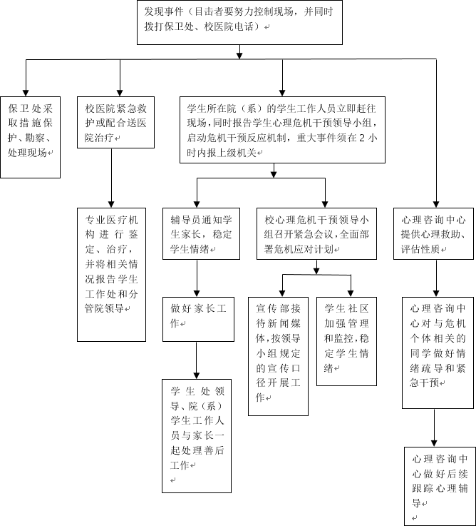 如遇心理危机事件,学院需同步上报到学生工作处心理咨询中心,听取心理咨询中心的意见与指导。