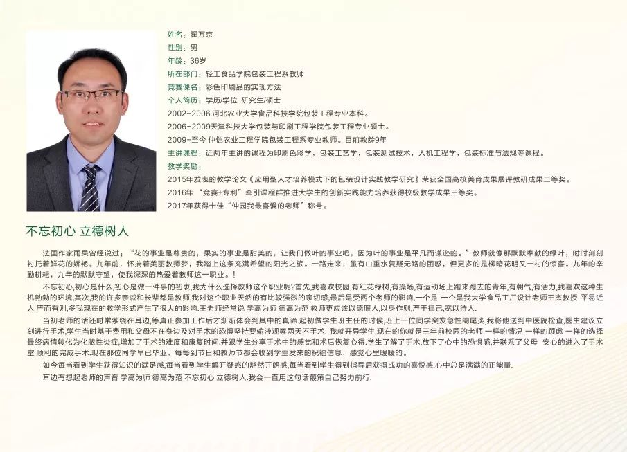 2009-至今仲恺农业工程学院包装工程系专业教师。目前教龄9年主讲课程:近两年主讲的课程为印刷色彩学,包装工艺学,包装测试技术,人机工程学,包装标准与法规等课程。