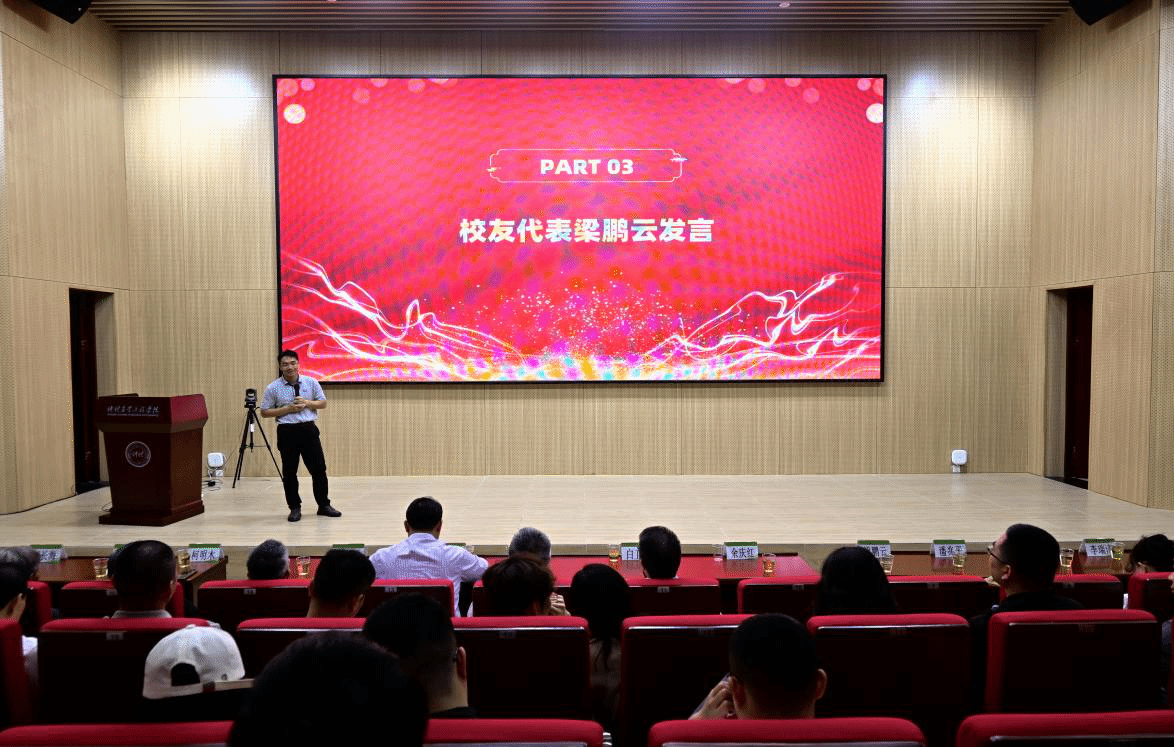 校友代表梁鹏云做热情洋溢的发言。他深情回顾了在仲恺的美好时光,分享了自己在学院学习和工作的经历,表达了对母校的深厚感情和感激之情。他表示,无论走到哪里,都会牢记母校的教诲和期望,努力工作、回报社会和母校。
