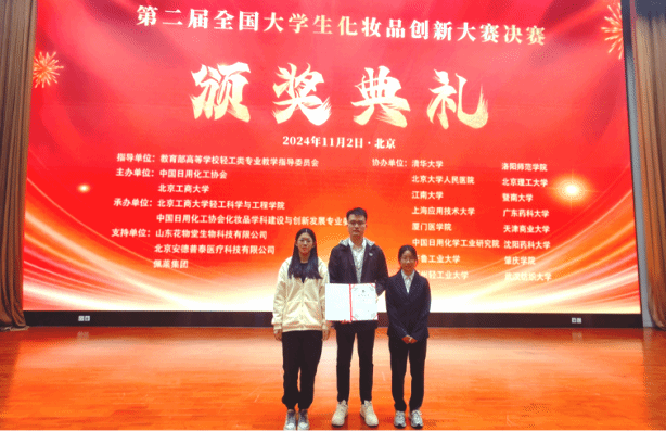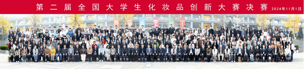2024年11月1日,在教育部高等学校轻工类专业教学指导委员会指导下,以“创新驱动美妆进步 青春助力梦想腾飞”为主题的第二届全国大学生化妆品创新大赛决赛在北京工商大学良乡校区正式拉开帷幕。本届大赛吸引来自全国百余所高校的 400 多支队伍报名参赛。本次比赛有三个组别,分别是产品创意组、配方设计组和包装宣传组。经过初赛专家评审,有94支队伍脱颖而出,成功入围决赛。11月1日决赛答辩后,在监督委员会监督下,经评审委员会审核,大赛组委会审定,最终评选出一等奖32支队伍,二等奖62支队伍。