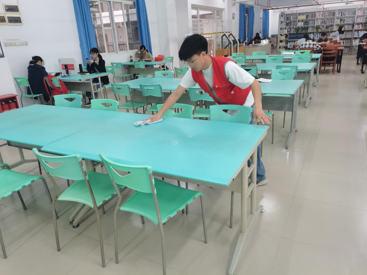 主题党日活动以践行雷锋精神为主线,党员们划分成两个小组,分别在白云校区图书馆和D栋教学楼开展清洁整理工作。在图书馆老师们的带领下,支部党员们细心整理书架、图书归类、擦拭桌面、清洁窗户卫生死角,经过清扫整理,图书馆面貌焕然一新。